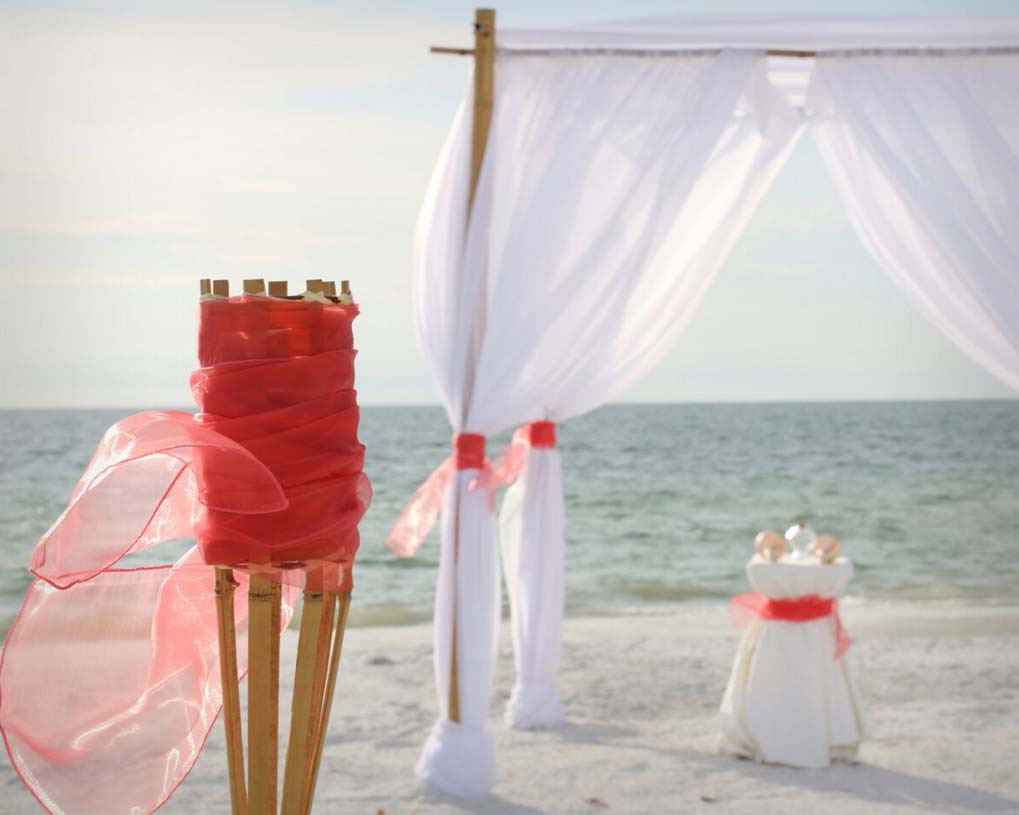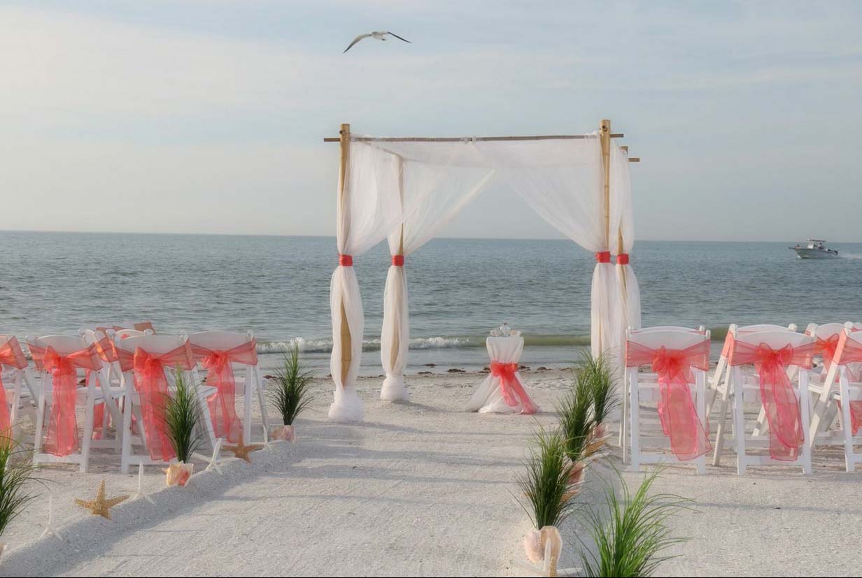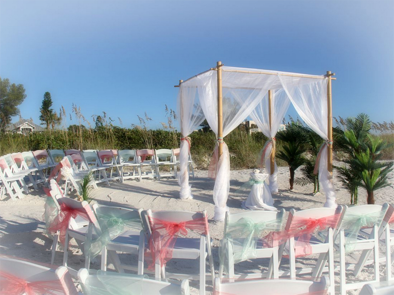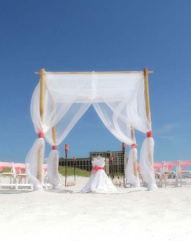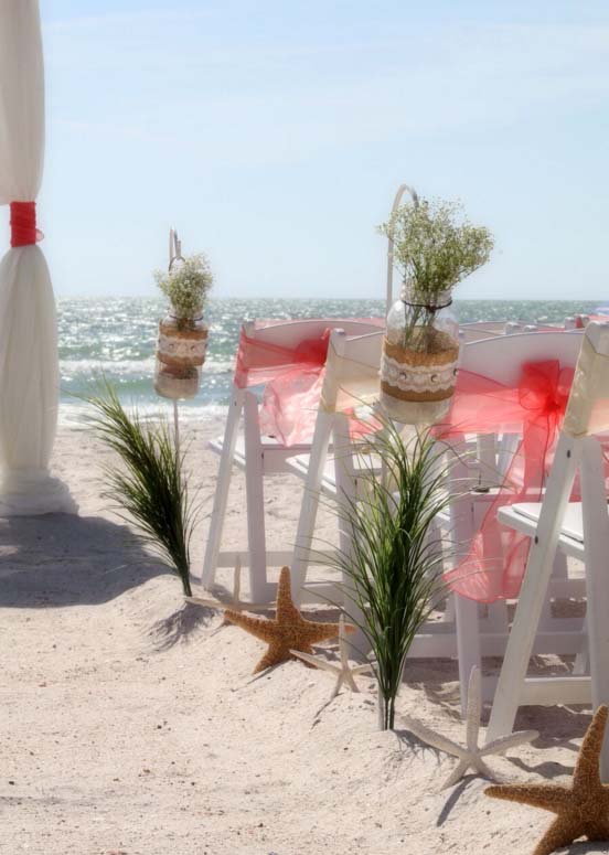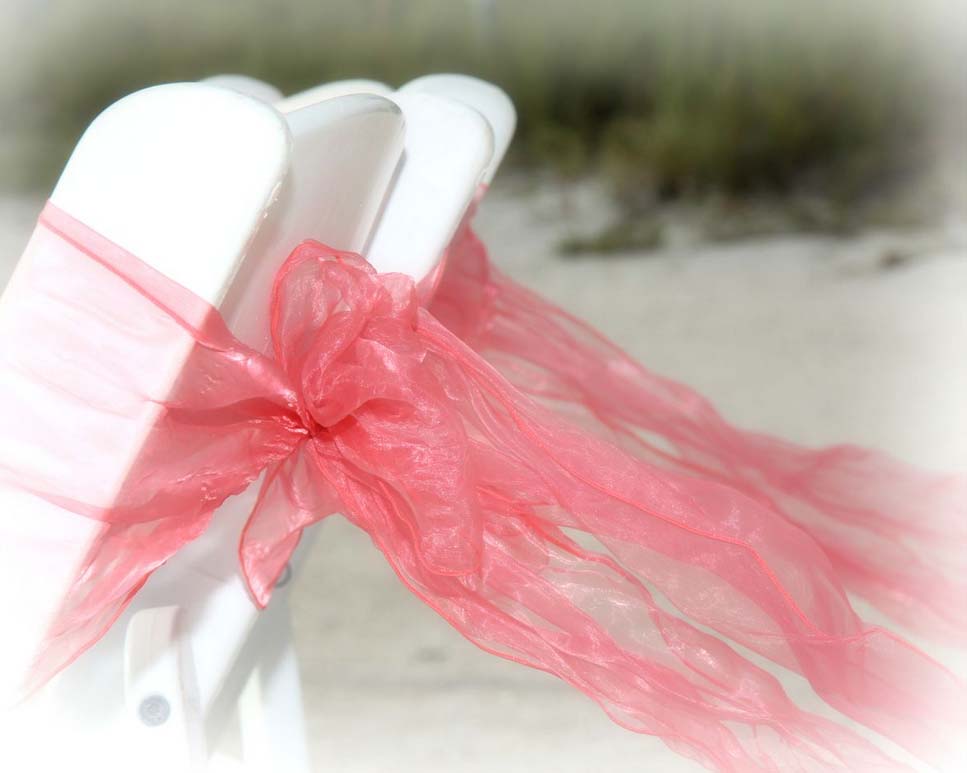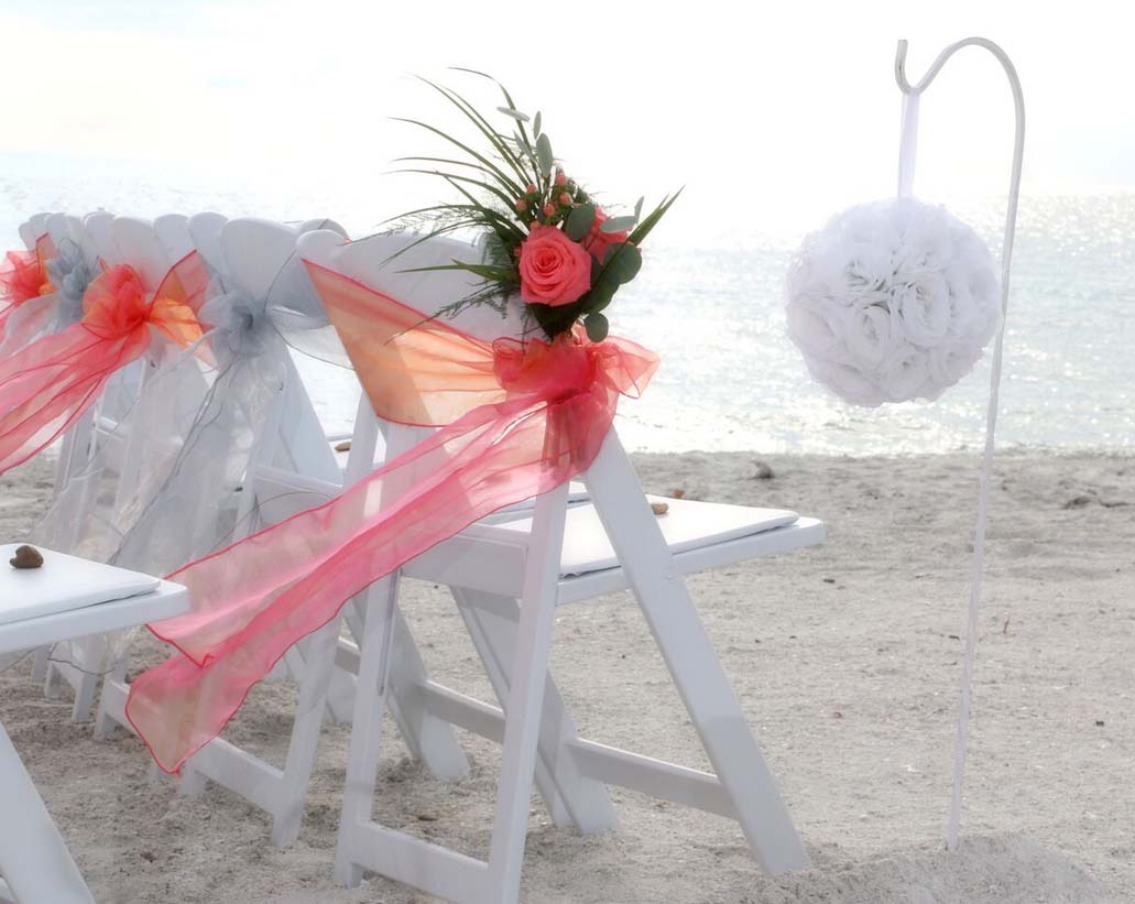 Beautiful shades of coral bring a distinctive and alluring style to your celebration. Choose from sashes on the chairs or the arch, to decorative elements which can be matched and mirrored in a belt for your gown, flowers in your bouquet, a stylish boutonniere or corsage, candles in lanterns to line the aisle. Coral intrigues and captivates - the essence of romance without the intensity of red, a quality of blending in and standing out at the same time. Floral accents can be added on the chairs or on the arch so you can tailor the decor to fit your style. We haven't had an arch in coral chiffon yet - maybe yours will be the first at Suncoast Weddings 🙂