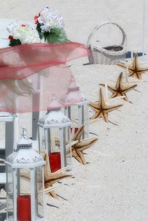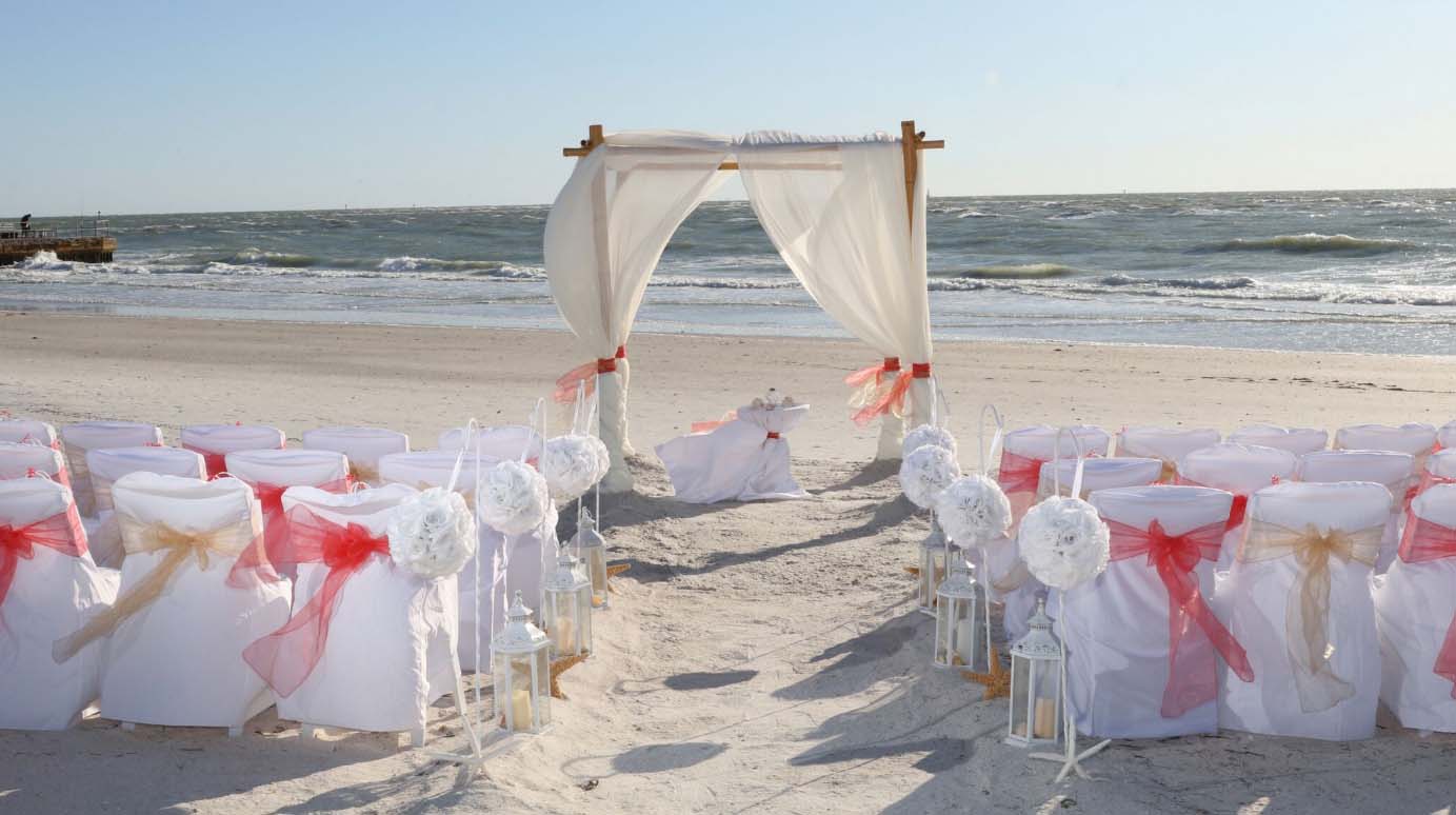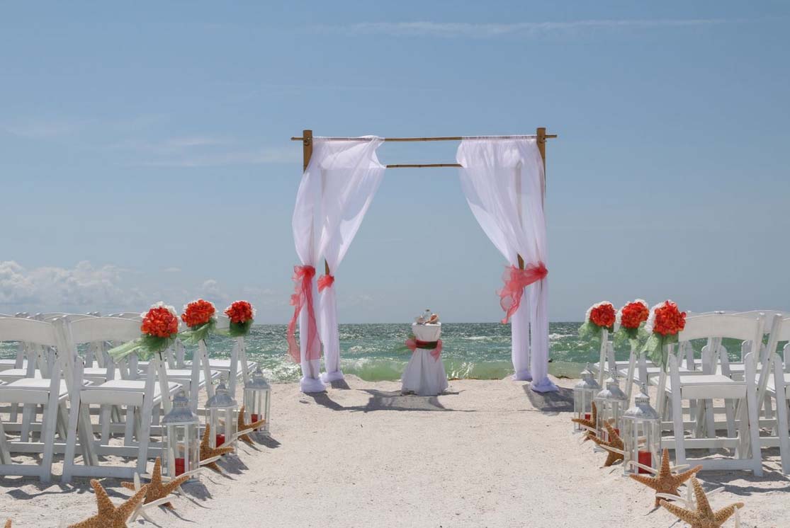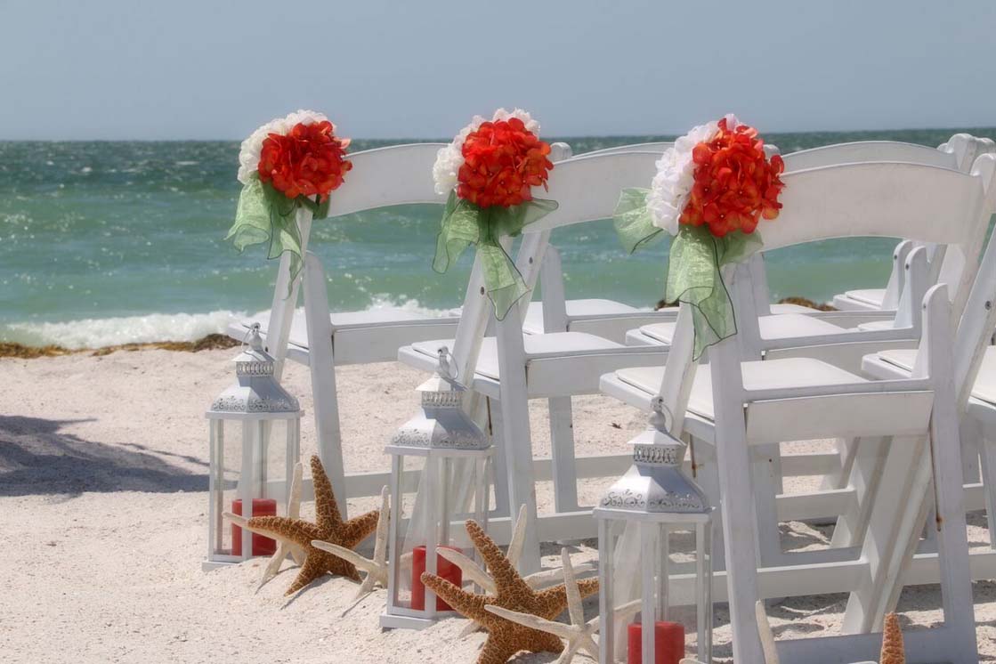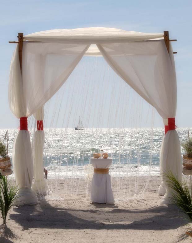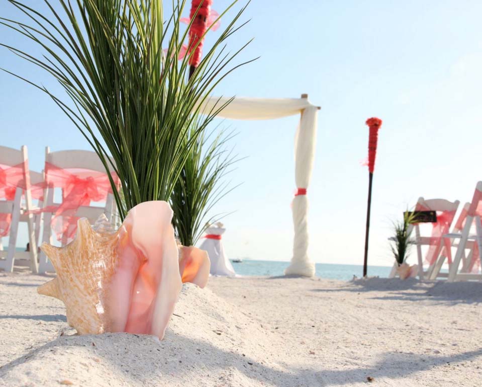 Beautiful shades of coral bring a distinctive and alluring style to your celebration. Choose from sashes on the chairs or the arch, to decorative elements which can be matched and mirrored in a belt for your gown, flowers in your bouquet, a stylish boutonniere or corsage, candles in lanterns to line the aisle. Coral intrigues and captivates - the essence of romance without the intensity of red, a quality of blending in and standing out at the same time. Floral accents can be added on the chairs or on the arch so you can tailor the decor to fit your style. We haven't had an arch in coral chiffon yet - maybe yours will be the first at Suncoast Weddings 🙂
