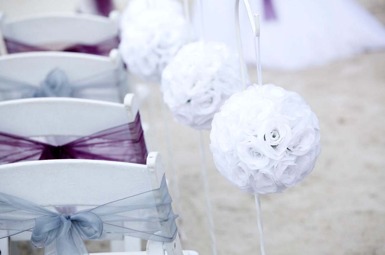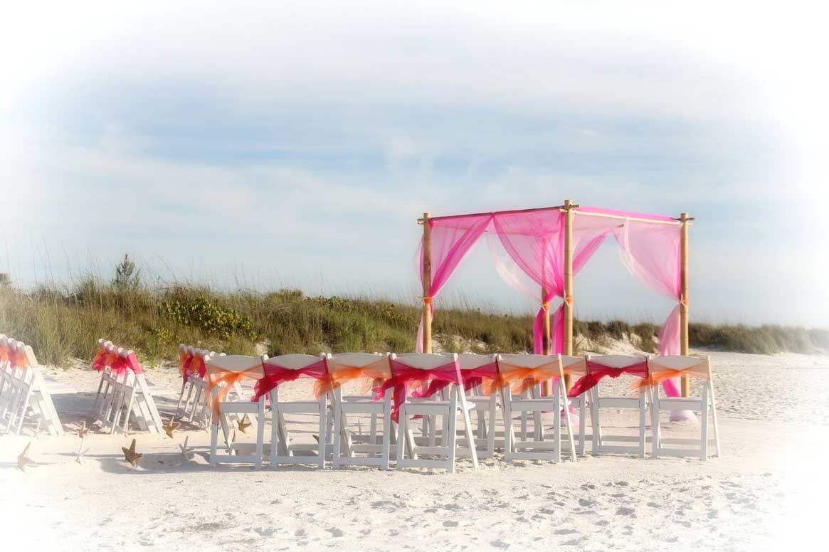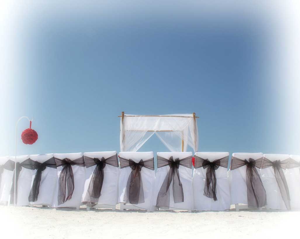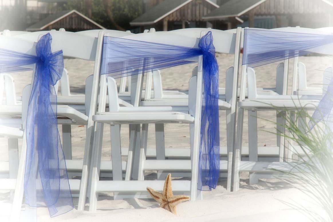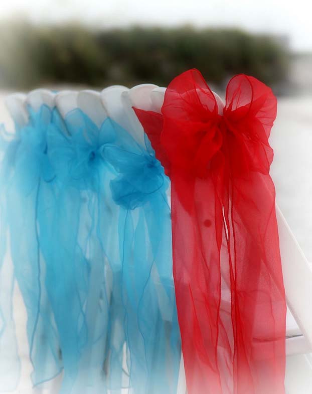 If you are combining two theme colors at the wedding, the colors can alternate by chair, by row or we can even layer the sashes together and their colors blend as one. Florida beach wedding chairs can reflect your individual style and make a colorful addition to your ceremony site.